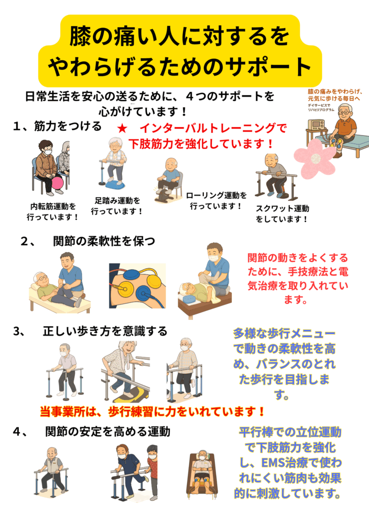 草加市にあるリハビリと運動を中心とした半日型のデイサービスです。9種目のリハビリメニューを提供し、特に歩行練習に力を入れています!