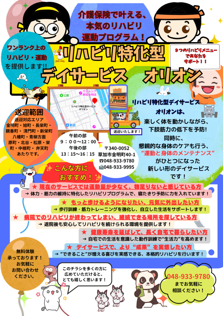草加市にあるリハビリと運動を中心とした半日型のデイサービスです。9種目のリハビリメニューを提供し、特に歩行練習に力を入れています!